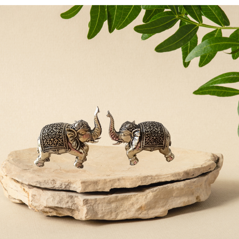 These elephants, standing at 2.5 inches and 3 inches in height, embody strength, grace, and auspiciousness according to Vastu and Feng Shui traditions. The raised and inward-curved trunks are believed to invite blessings, success, and spiritual upliftment.