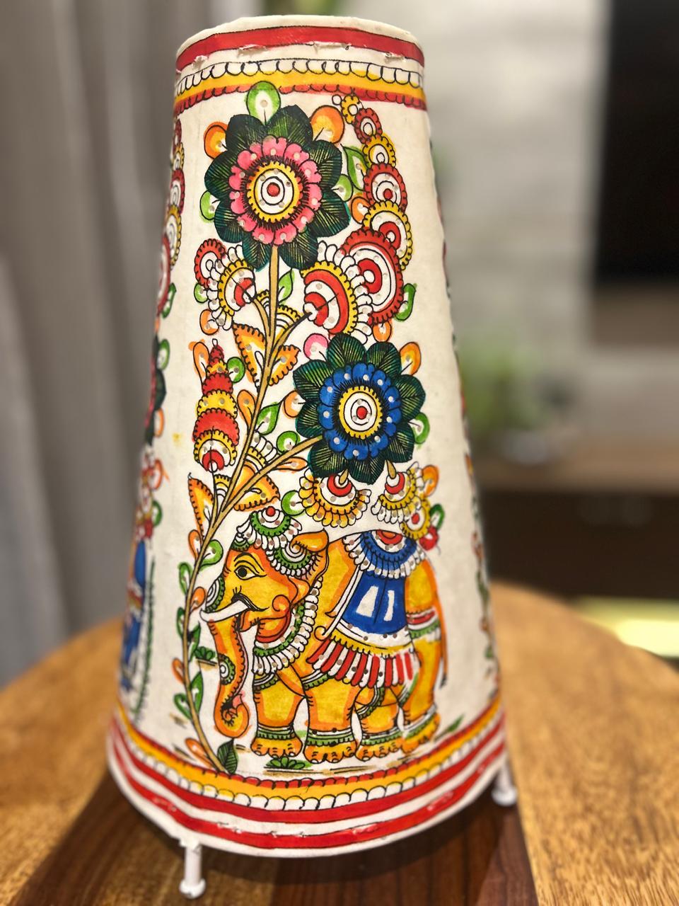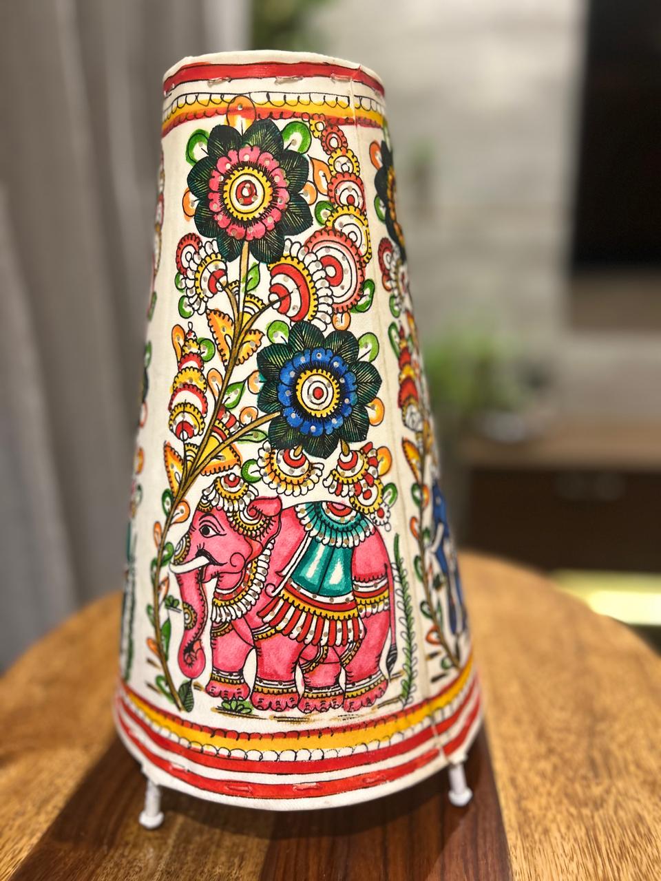 This is a beautifully handcrafted Tholu Bommalata leather lampshade, featuring intricate floral and Elephant motifs. The lampshade is designed in a Conincal shape with a sturdy four-legged metal stand, making it a perfect table accent.