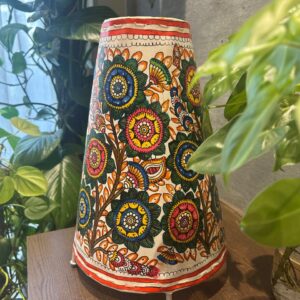 The artwork features a bold floral motif in the center, surrounded by elaborate vines, leaves, and ornamental elements. The bright color palette—with shades of orange, green, yellow, and red—adds a lively and festive charm. The detailed patterns and perforations, characteristic of Andhra Pradesh’s shadow puppetry tradition, make this lampshade not just a source of light but a cultural statement. When lit, it creates a mesmerizing glow, enhancing any space with its traditional aesthetic.