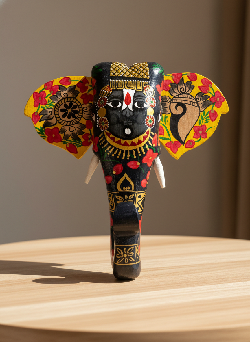 Hand-Painted Wooden Elephant Face with Shrinath Ji – Wall Mount (12″ height) | Jodhpur Craftsmanship – 1 Piece