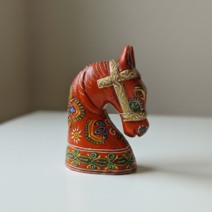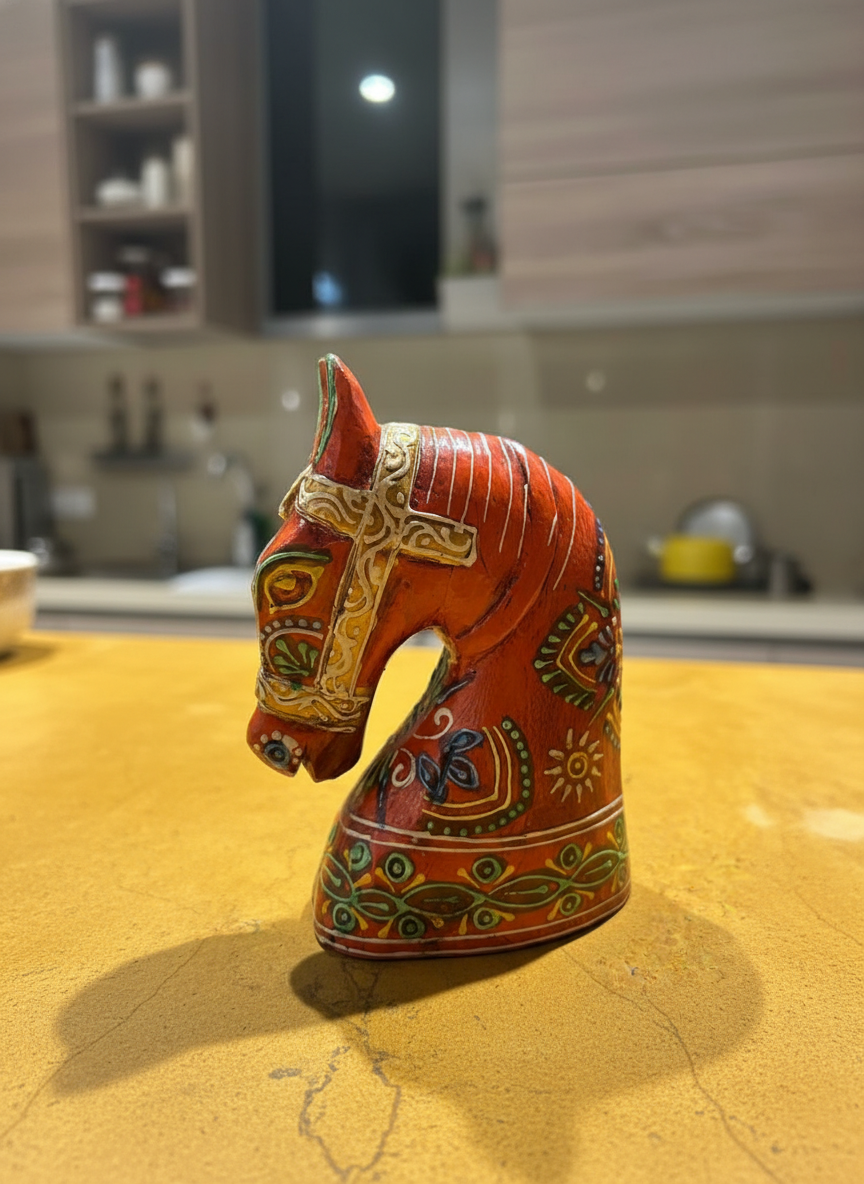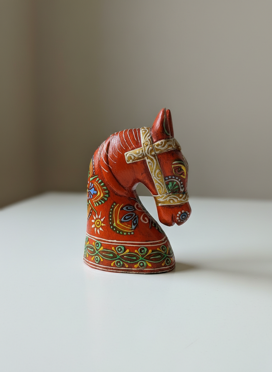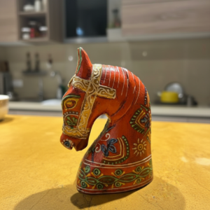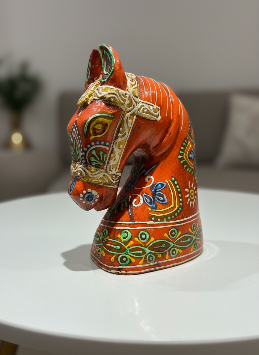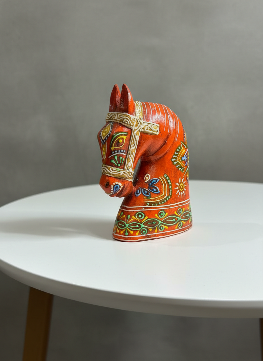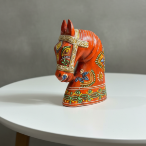 Bring a regal, rustic charm to your living space with this handcrafted Wooden Horse Face in Orange, inspired by traditional Rajasthani art. Painted by skilled artisans in Jodhpur, each piece showcases intricate detailing and vibrant colors that reflect the rich heritage of India. Perfect for table tops, shelves, or entryways, this decorative accent is available in small size to suit different spaces and styling needs.