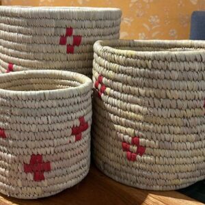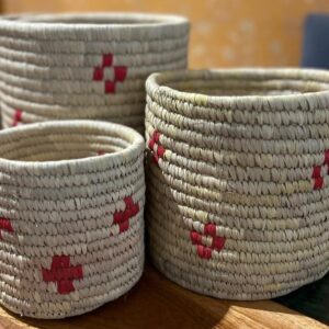 Bring home the charm of nature and craftsmanship with this Handmade Sabai Round Planter Set of 3. Expertly woven from natural Sabai grass, each planter features a beautiful red flower design that adds a touch of color and elegance to your décor.