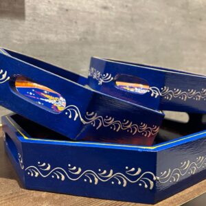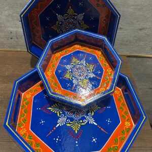 Be the first to review “Handpainted Blue and Orange Wooden Octagonal Tray – set of 3”