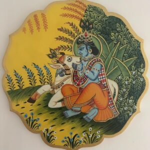 A handpainted wooden wall art plate depicting Lord Krishna with a sacred cow, crafted in traditional Pichwai style for spiritual and heritage d?cor.