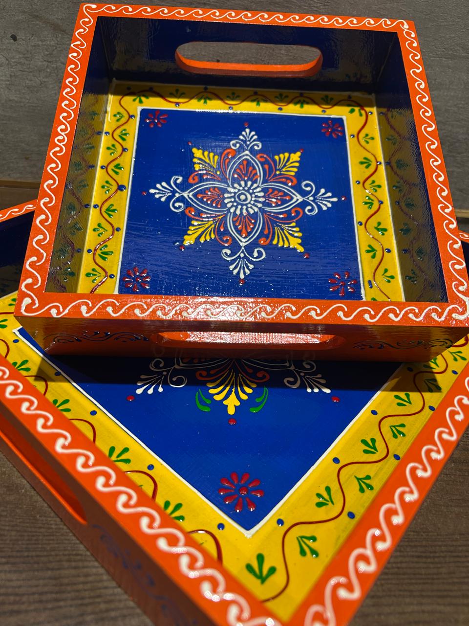 Handpainted Yellow, Blue and Orange Wooden Square Tray – set of 2