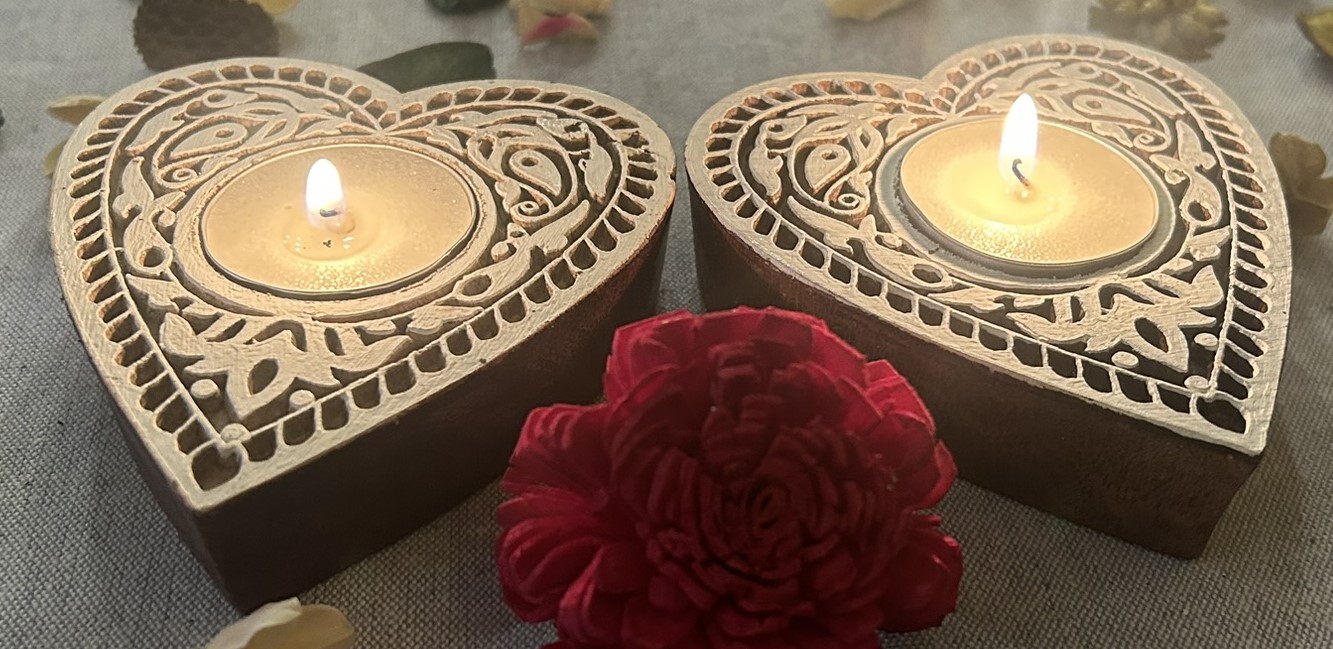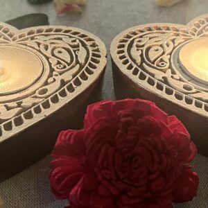Express warmth and love with this Set of 2 Heart-Shaped Wooden T-Light Candle Holders, beautifully handcrafted to bring romance and charm into any space.