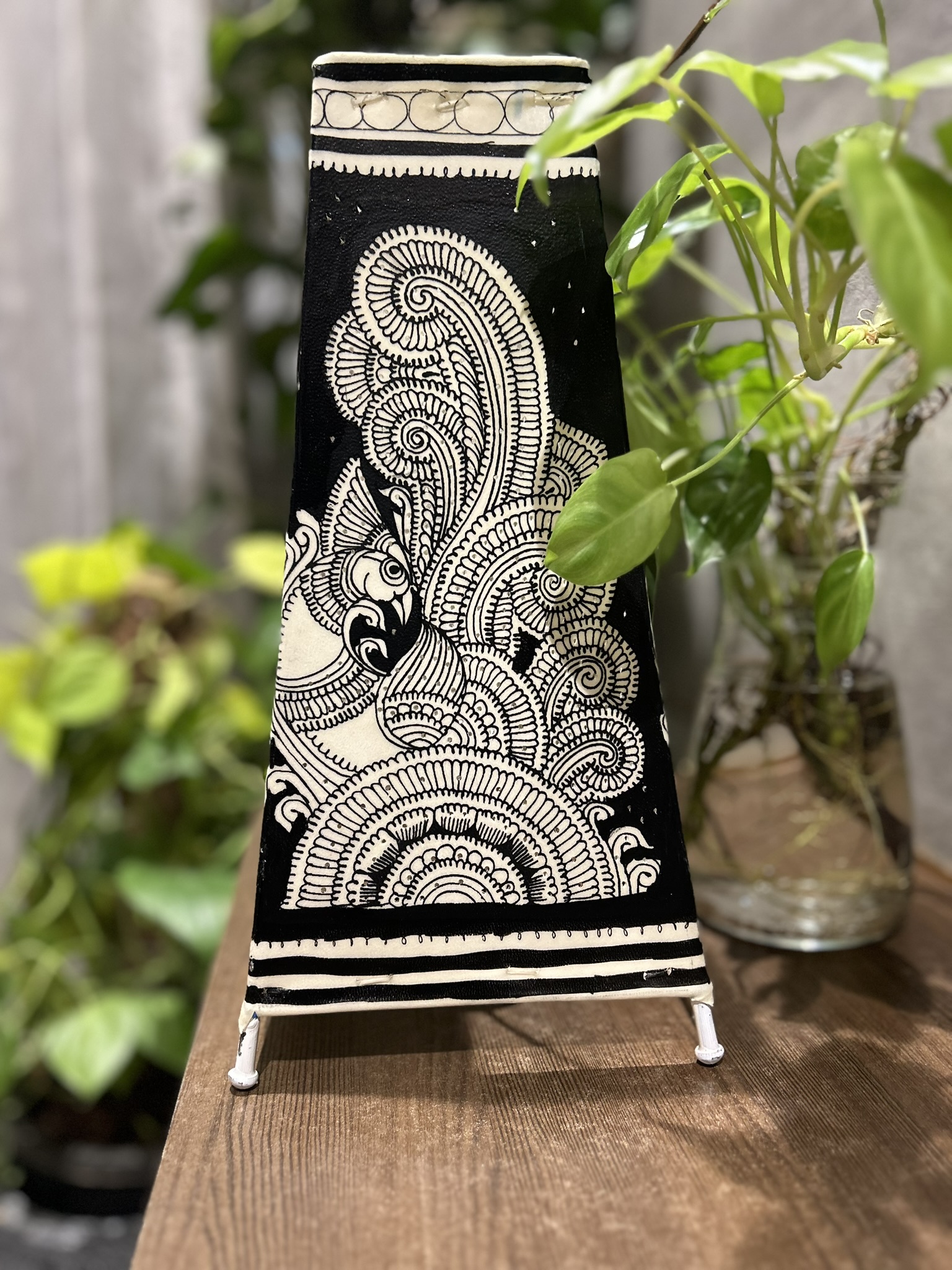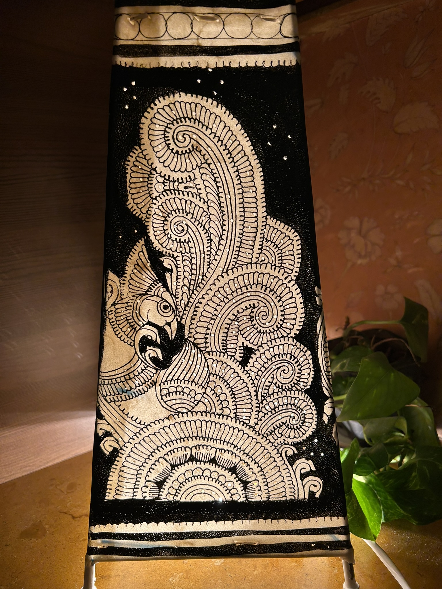 It showcasing a beautifully detailed traditional Indian art style. The design features a Elegant peacock motif, intricately painted with bright colors like orange, green, red, Black and yellow. The elegant curves and fine detailing reflect the rich heritage of Andhra Pradesh’s shadow puppet art.