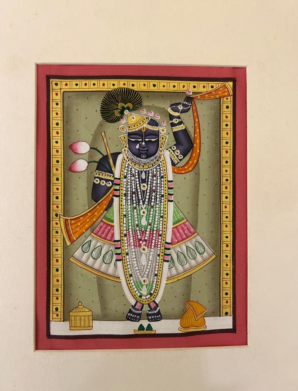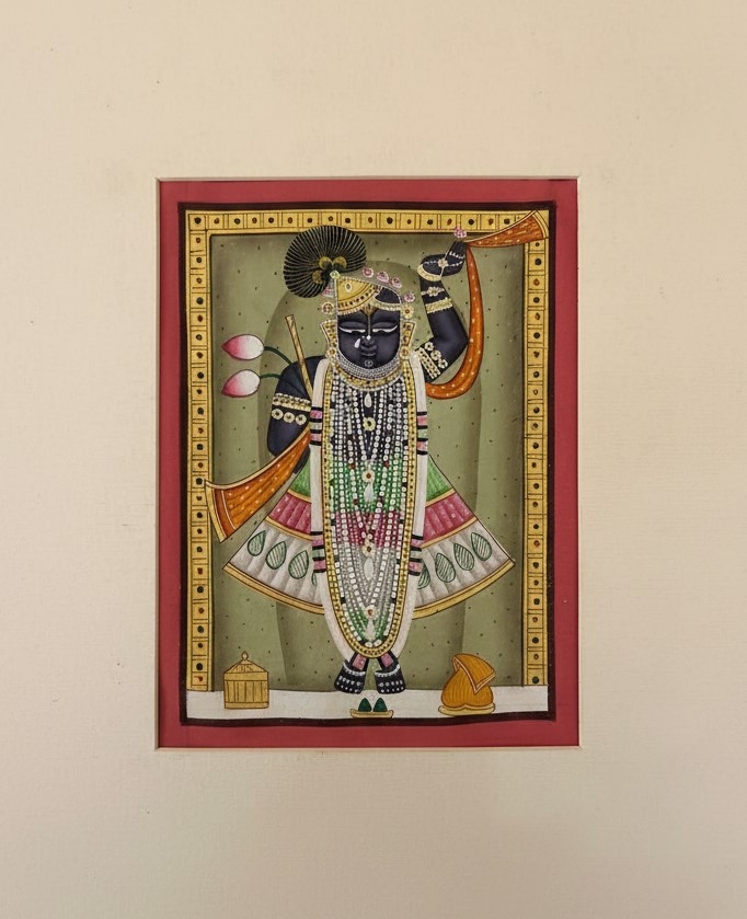 A beautifully detailed Shrinath Ji Pachwai art Hand crafted on premium cloth, reflecting timeless devotion and traditional Nathdwara artistry. Perfect for home temples, sacred corners, or gifting.