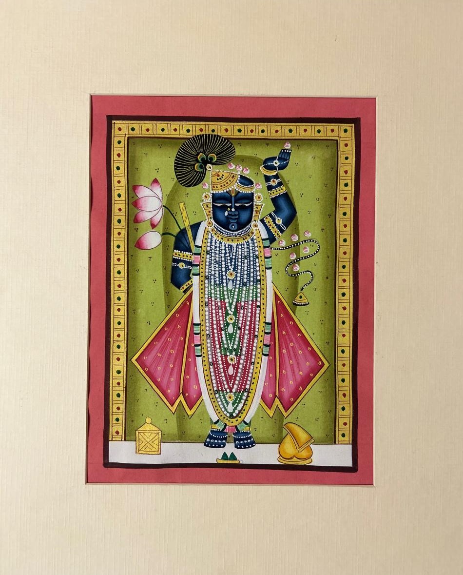 A beautifully detailed Shrinath Ji Pachwai art Hand crafted on premium cloth, reflecting timeless devotion and traditional Nathdwara artistry. Perfect for home temples, sacred corners, or gifting.