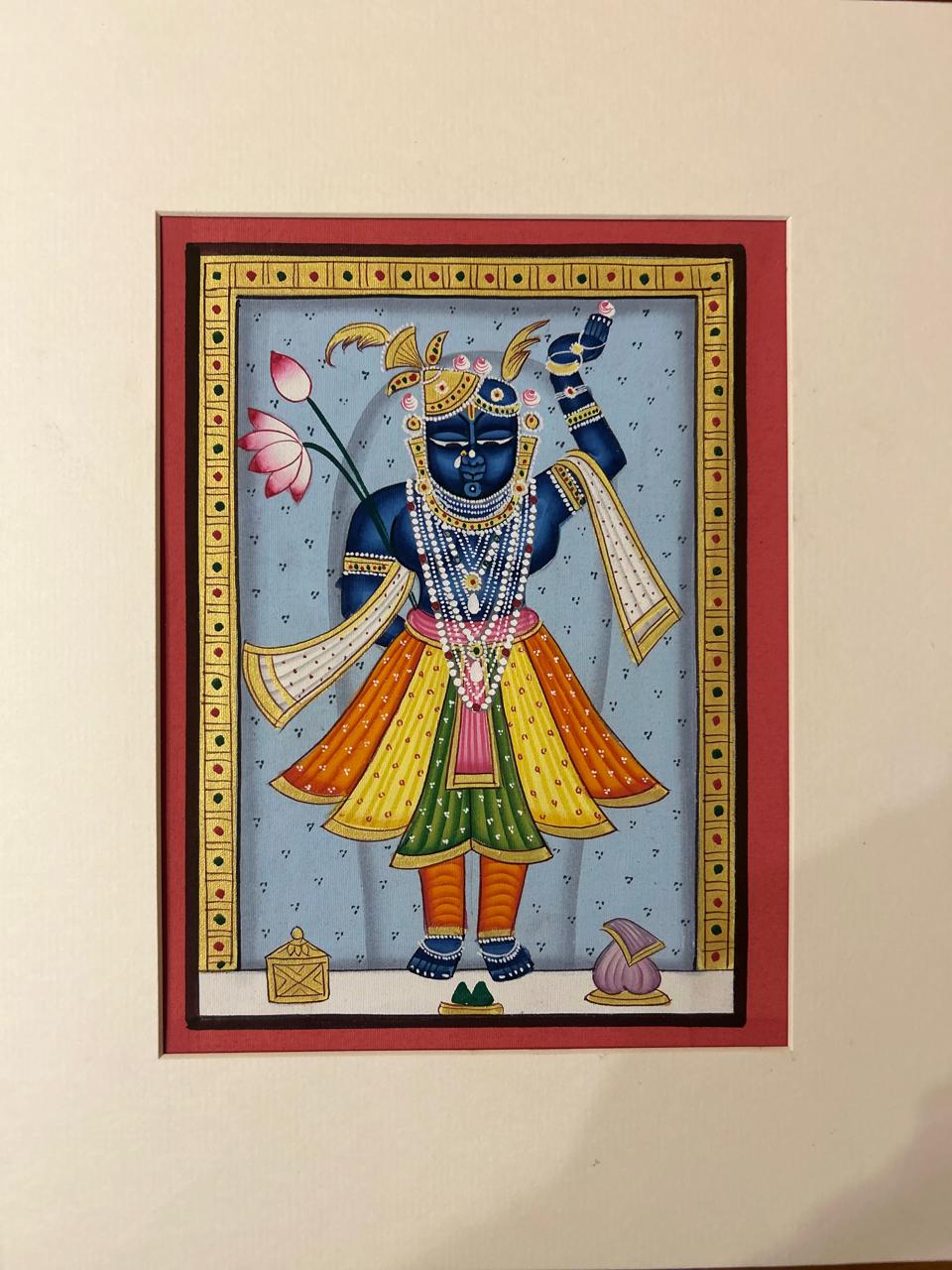 A beautifully detailed Shrinath Ji Pachwai art Hand crafted on premium cloth, reflecting timeless devotion and traditional Nathdwara artistry. Perfect for home temples, sacred corners, or gifting.
