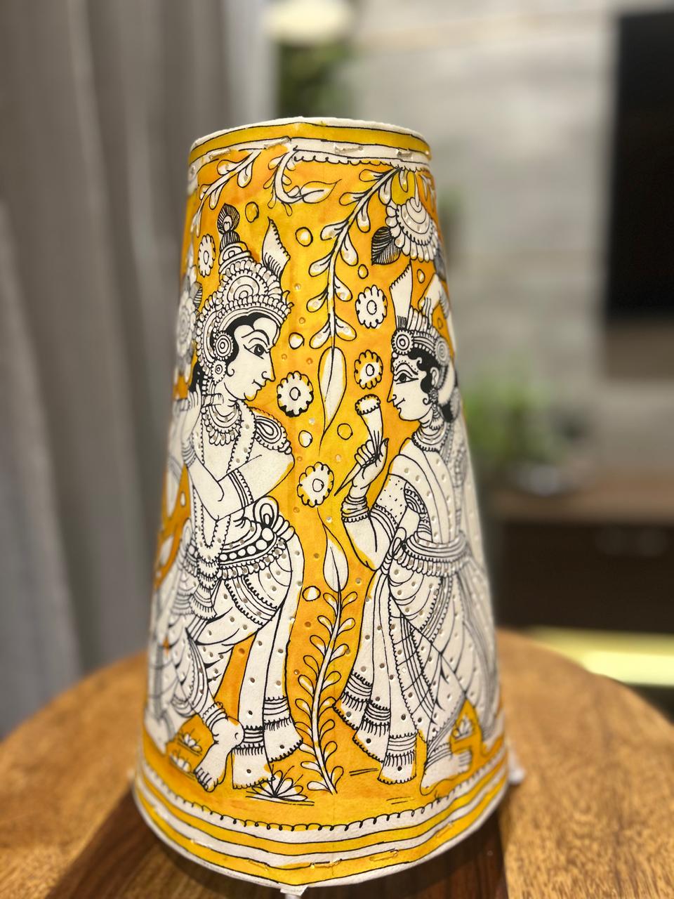 This stunning Tholu Bommalata leather lampshade features a monochrome Yellow-and-white depiction of mythological figures, likely inspired by Indian epics such as the Ramayana or Mahabharata. The detailed floral canopy, intricate jewelry, and elaborate attire reflect the fine craftsmanship of traditional Andhra shadow puppetry art.