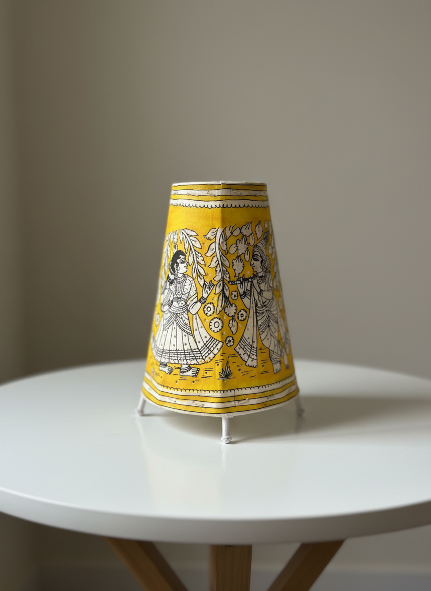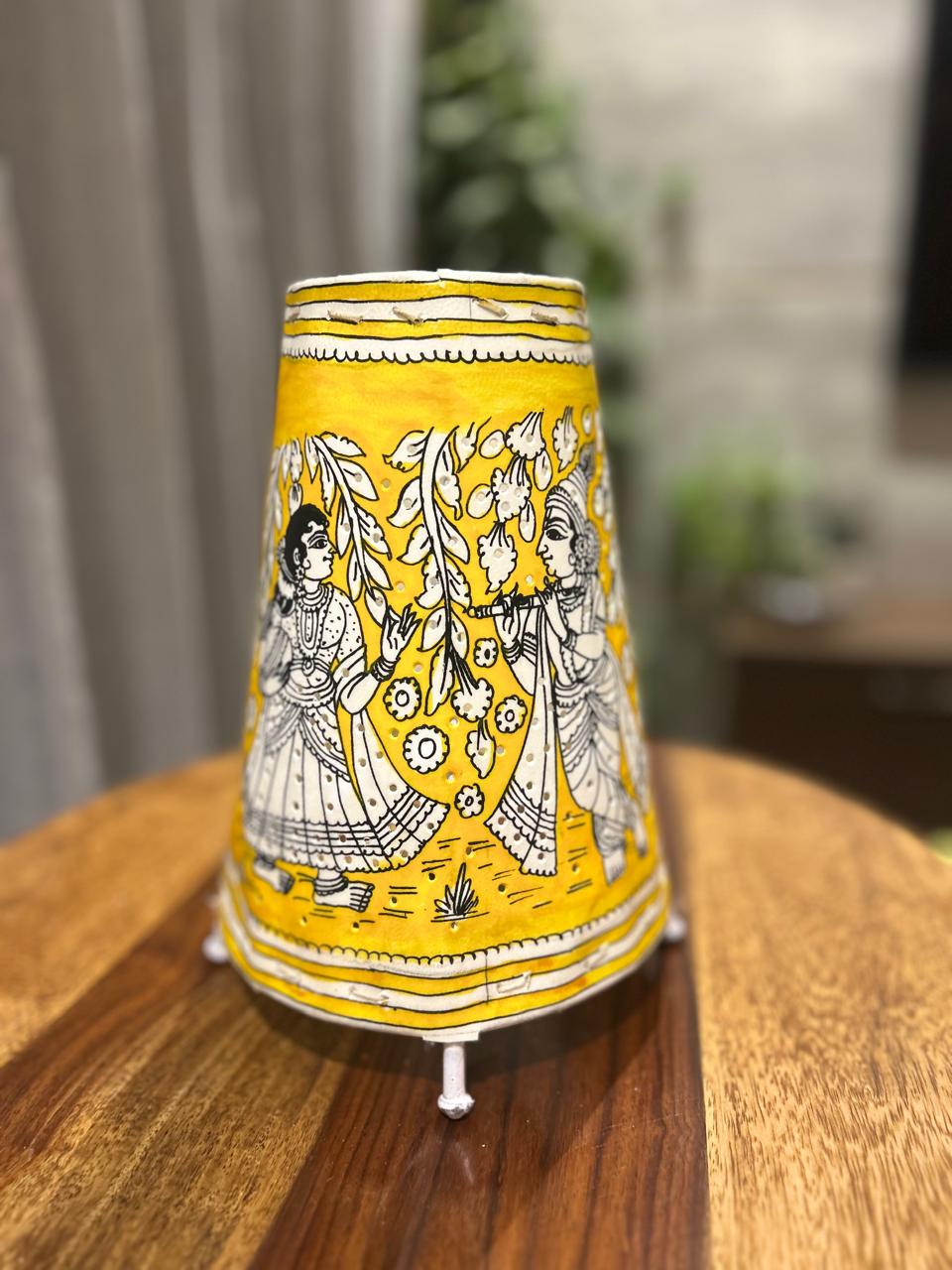 Radha Krishna Yellow - Tholu Bommalata Leather Lampshade with Plug & Wire – 9-InchRadha Krishna Yellow – Tholu Bommalata Leather Lampshade with Plug & Wire – 9-Inch