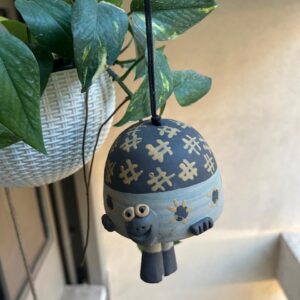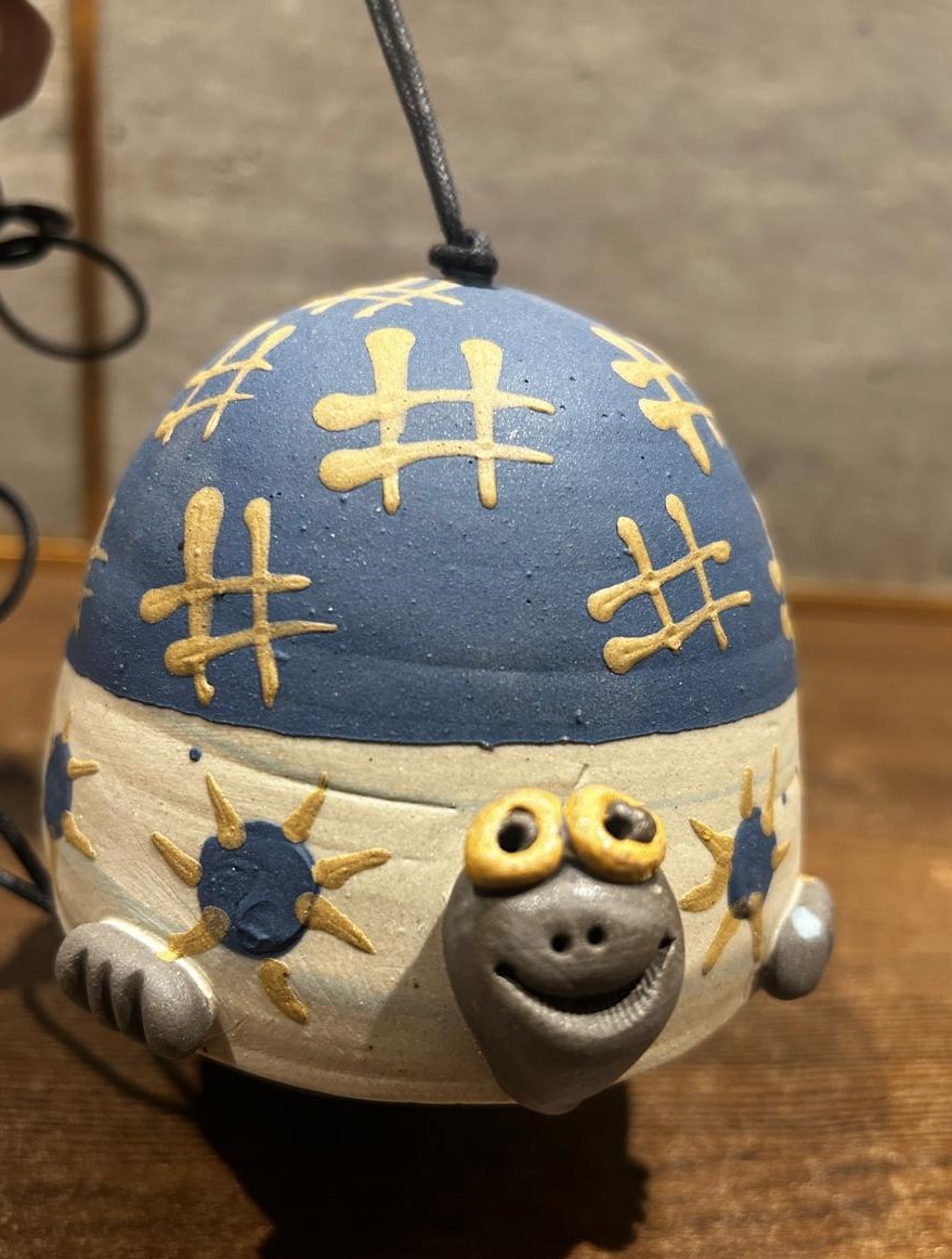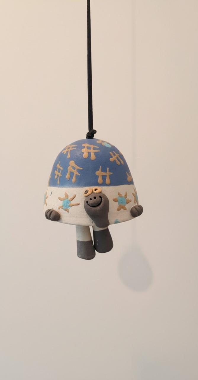 A one-of-a-kind nerikomi hanging bell featuring a tortoise, crafted in patterned clay and finished with a gentle, peaceful chime.