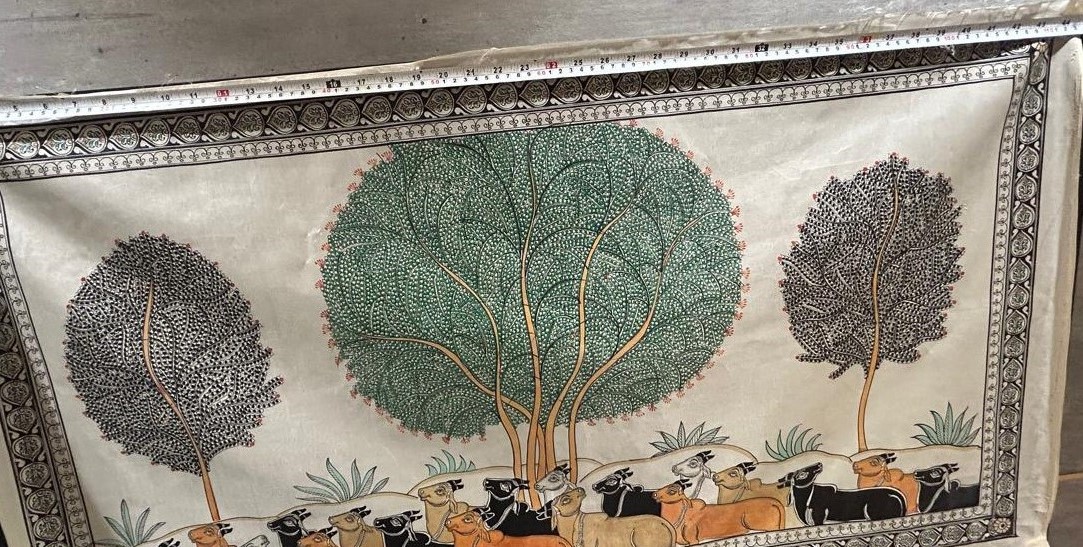 Tree of Life #Big CowPichwali1 - Pattachitra Art - Tussore Silk Painting - 24*44 inch - In Silk Cloth - UnframedTree of Life #Big CowPichwali1 – Pattachitra Art – Tussore Silk Painting – 24*44 inch – In Silk Cloth – Unframed